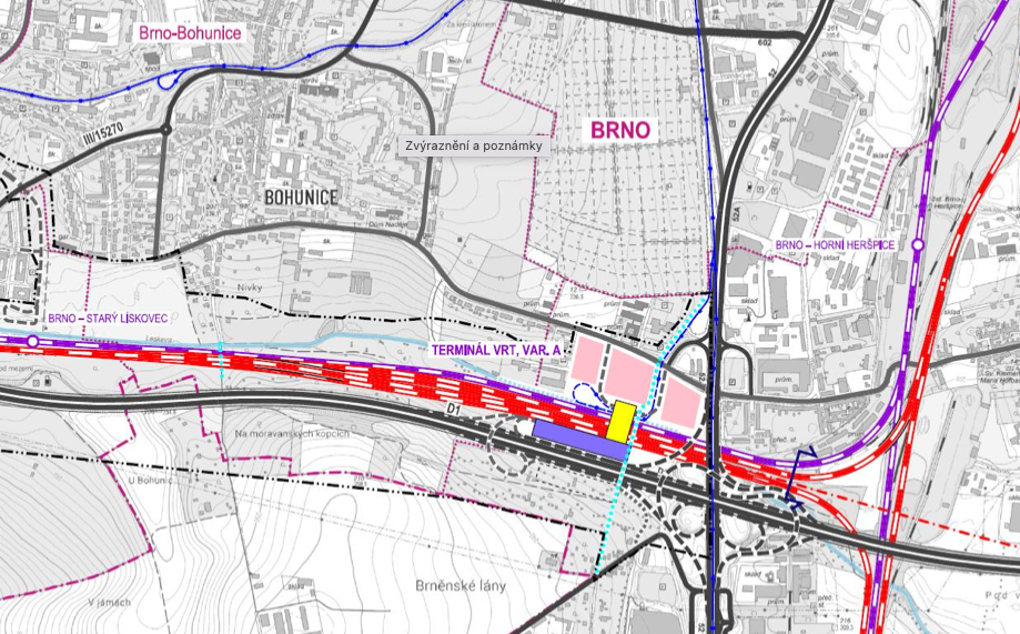 Pod Brnem vznikne vlaková zastávka Brno-Vídeňská. Nebude to žádné nádraží, kde by vlaky končily nebo začínaly. Slovo „terminál“ zde označuje nácestnou zastávku na vysokorychlostní trati. Terminál Brno-Vídeňská VRT bude u dálnice D1 a I/52, na příjezdu po VRT z Vysočiny a na trati od Střelic. Dopravní model předpokládá až 83.000 (!) cestujících denně. Tím se zastávka Vídeňská stane třetím největším nádražím v Brně, po brněnském hlavním nádraží a po stanici Brno-Černovice.