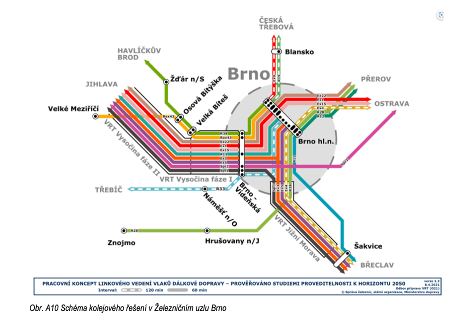 Provoz VRT vlaků zároveň klade velké nároky na kapacitu uzlu a na vysokou míru spolehlivosti, kdy každý nedostatek v dopravní situaci v brněnském uzlu bude mít dopady do provozu v širokém okolí. Hlavním místem zastavení pro osobní vlaky bude stanice Brno hlavní nádraží. Celkové náklady na modernizaci brněnského uzlu jsou v roce 2026 odhadovány na 73 mld Kč a počátek výstavby je v roce 2028.